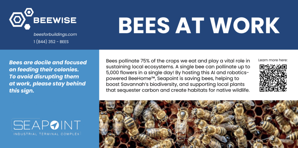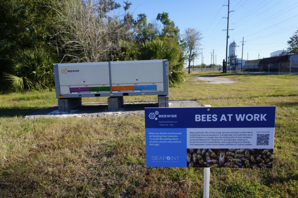 A new state-of-the-art Beewise BeeHome™ unit was recently installed at SeaPoint Industrial Terminal Complex in Savannah, deepening our company’s commitment to sustainability. The Beewise unit, which was delivered and installed on October 30, uses AI and robotics to monitor the health of our bee colony remotely, 24/7.
